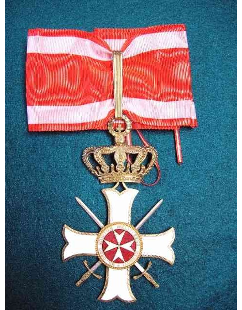 The Cross of Merit of the Order of Malta.  Founded in 1918 by the Grand Priory in Austria, and extended to the entire Order of Malta worldwide in 1920.  Military Division with swords, gilt silver and enamels construction, mint neck ribbon.  Beautiful.