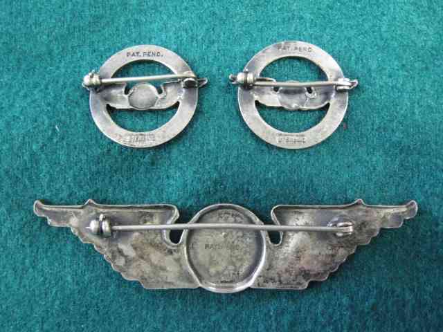 The WWII Civil Aeronautics Administration War Training Service consisted of civilian pilots who trained the Army Air Corps cadets.  Lovely full feathered sterling pilot's wing and pair of uniform lapel devices. Quite scarce anymore.