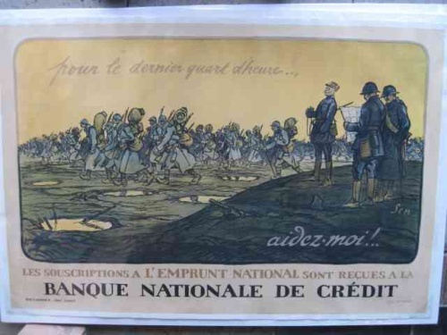 Lovely WWI French patriotic poster by Sem.  Depicts the French troops moving to the left horizon during the "last quarter hour" of the war.  Bond drive effort to support the troops for the last push.  Poilus are wearing horizon blue uniforms which were mostly obsolete by 1918.  Golden yellow background gives the poster the feel of the golden end of hostilities being in sight.  Large, looks to be about 32 x 48 inches in size.  Fully deacidifed and mounted on linen.  Ready to frame and hang.
